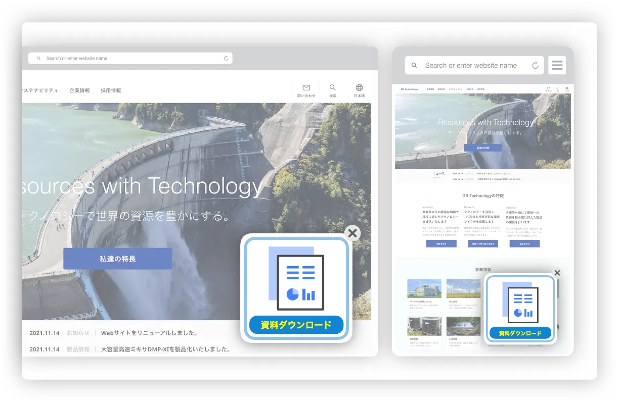 ポップアップ機能では、Webサイトに訪れたユーザーに対して新商品やセミナー開催といった重要なお知らせ、資料ダウンロードやタイムセールといったコンバージョンにつながるアクションを促すポップアップをノーコードで配信できます。