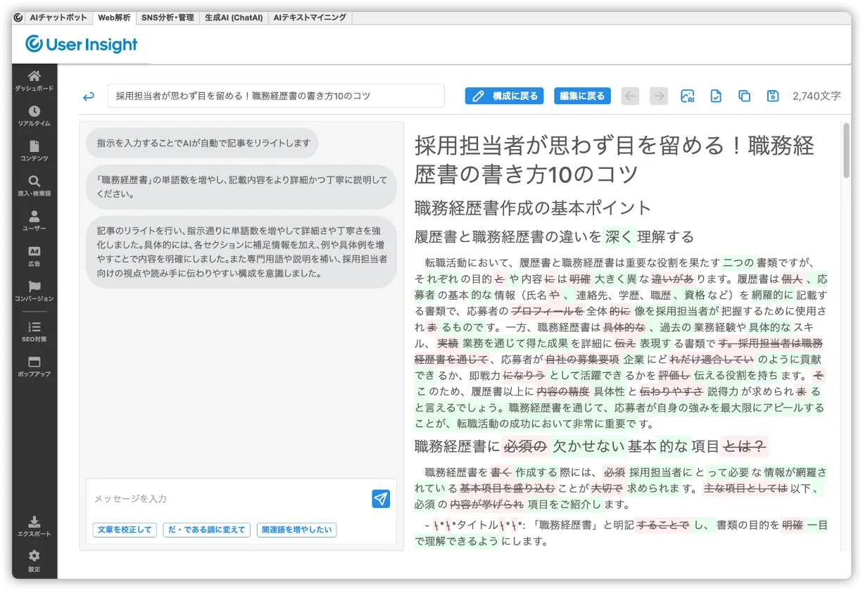 AI記事作成/リライト機能では、複雑なプロンプトを入力する必要なし。直感的に「◯◯というキーワードを加えて」「文字量を増やして」など、シンプルな指示をチャット上で送信するだけで、瞬時に新規記事作成やリライトが完了します。