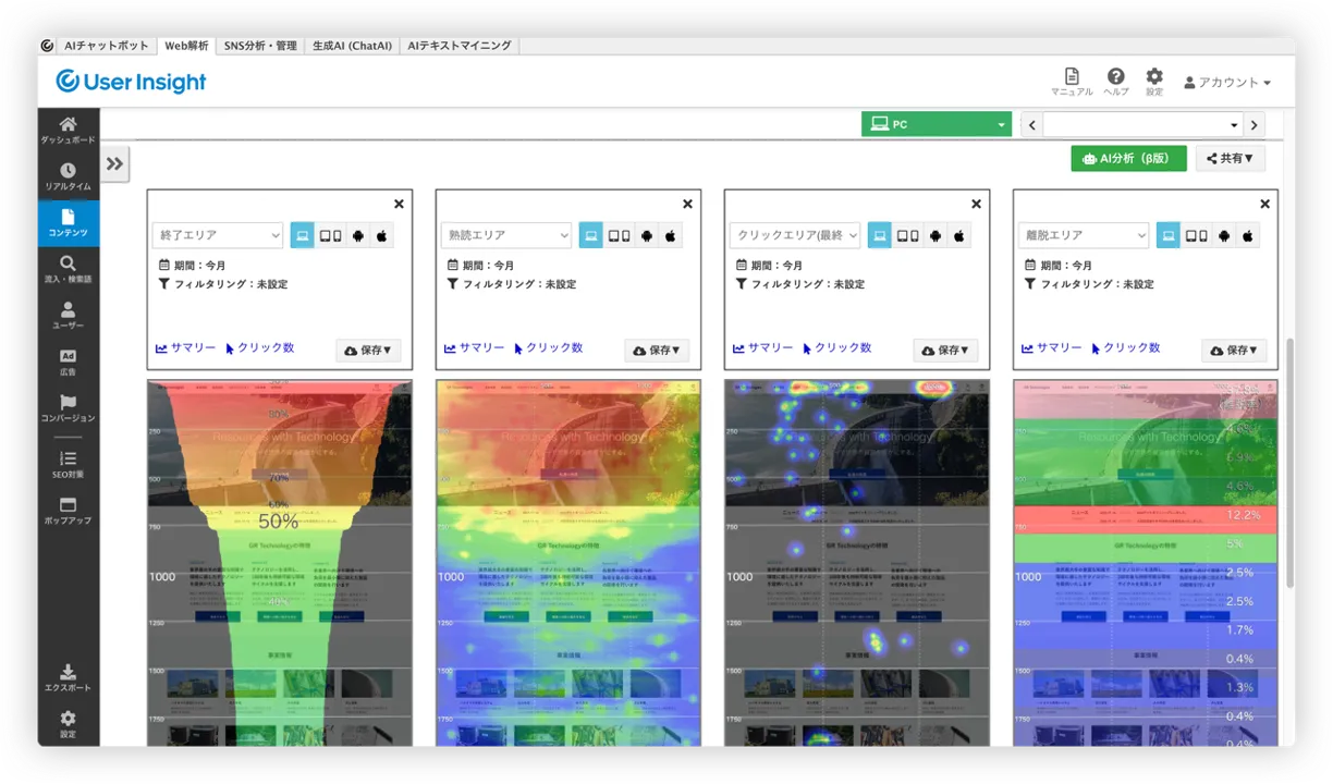 ヒートマップ分析機能では、ユーザーがページ上でどの部分を注視しているかを一目で把握できます。初心者にもわかりやすいので、関係者への報告や改善提案が容易に。