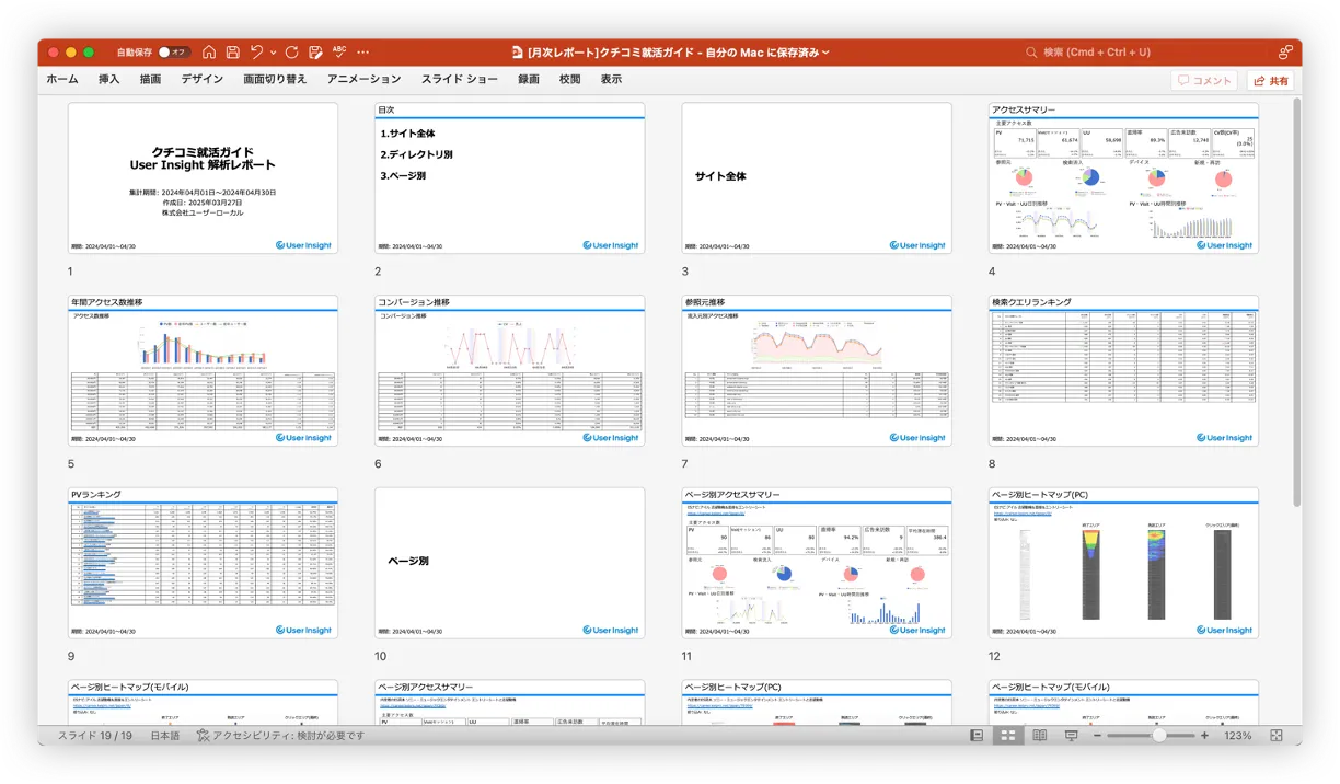 アクセス数分析機能では、Webサイトを運営する上で欠かせないページビュー、セッション、滞在時間などの数字を簡単に確認。自動で作成されるPowerPointレポートを利用することで、社内報告もスムーズに。