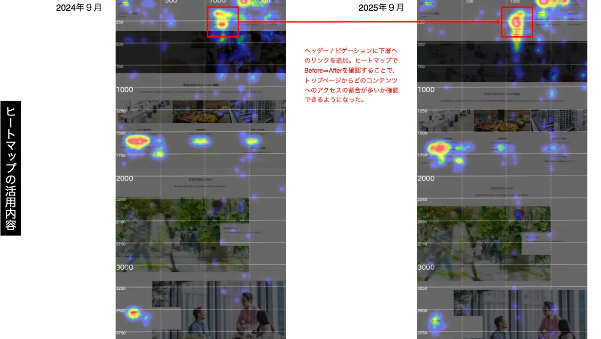 User Insightの活用による成果は、数字として如実に表れた。商環境事業のソリューションサイトを立ち上げた際、アクセス数が伸び悩んでいたため、ヒートマップによる分析を実施した。以前はヘッダーからの導線のみだったが、トップページ上にソリューションコンテンツを一覧表示して導線を強化した結果、3か月間のPV数が139%に改善した。