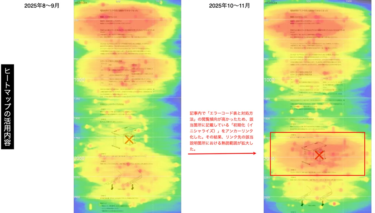 また、オカムラではFAQ記事を拡充しており、その改善にもヒートマップを活用している。「読んでほしいところまでユーザーが辿り着いてないことが、ヒートマップで判明しました。そこでアンカーリンクを設置したところ、必要な情報にしっかり辿り着いてもらえるようになりました」とA氏。