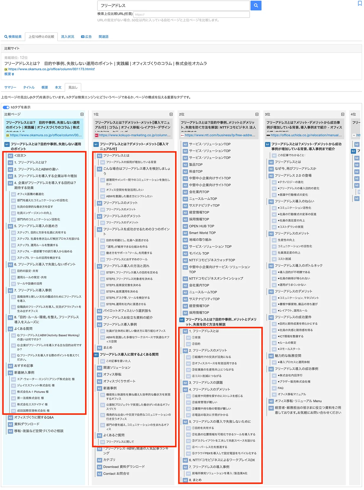 例えば「フリーアドレス」といったキーワードにおいて、検索上位にある競合サイトの構成を比較し、見出しタグを調整する。手作業では膨大な時間がかかる競合分析を効率化し、内部施策に役立てているという。N氏は「直すべきところの可視化がしやすいですね。課題は数多くあるため、どこから手をつけるべきかの参考になります。一つのツールでSEO施策まで完結するのは非常に嬉しいポイントです」と評価する。