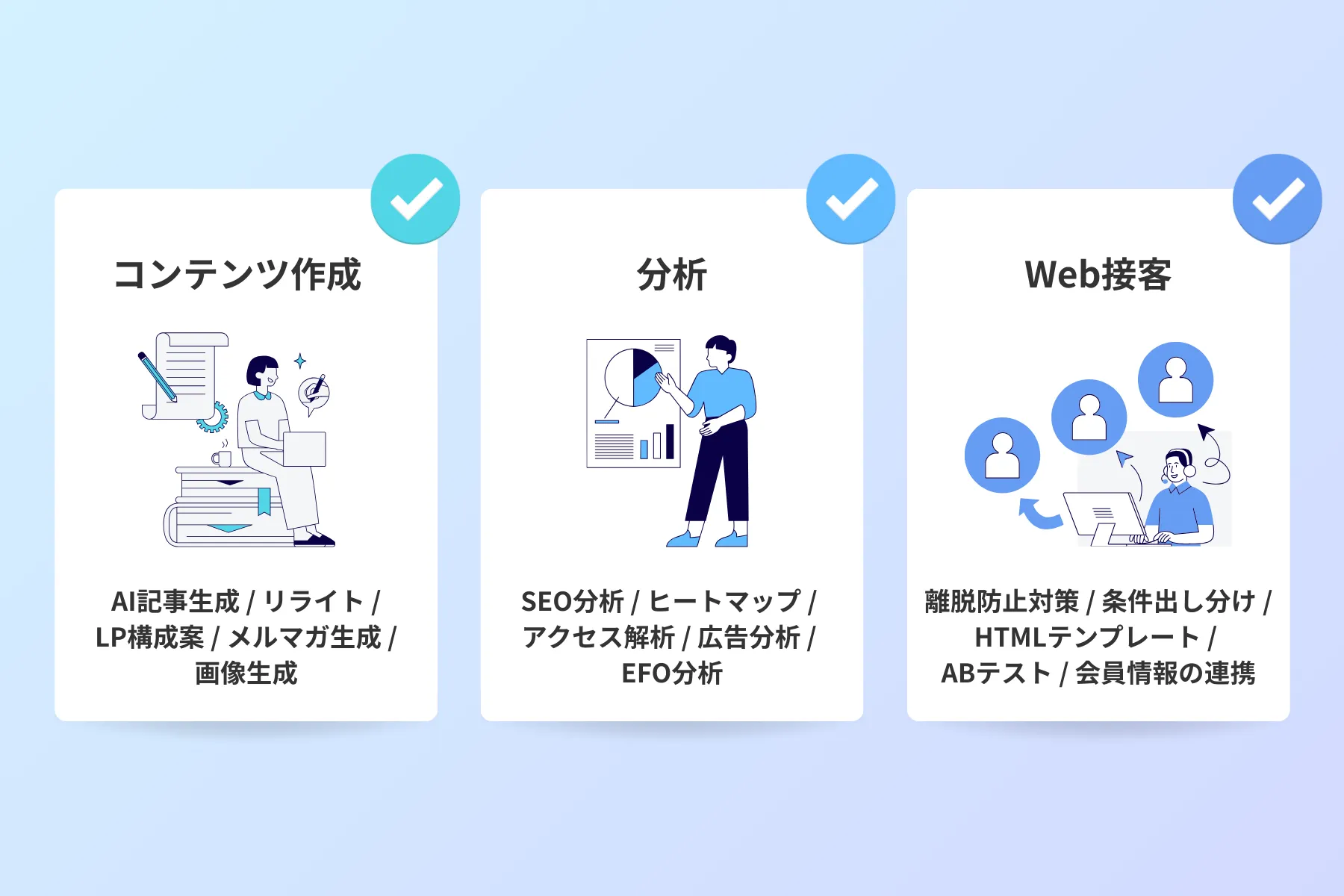 User Insightは、アクセス解析・ヒートマップ・SEO分析でユーザー行動を可視化し、AIによるコンテンツ生成やWeb接客施策までをワンストップで実行できるデジタルマーケティングツールです。