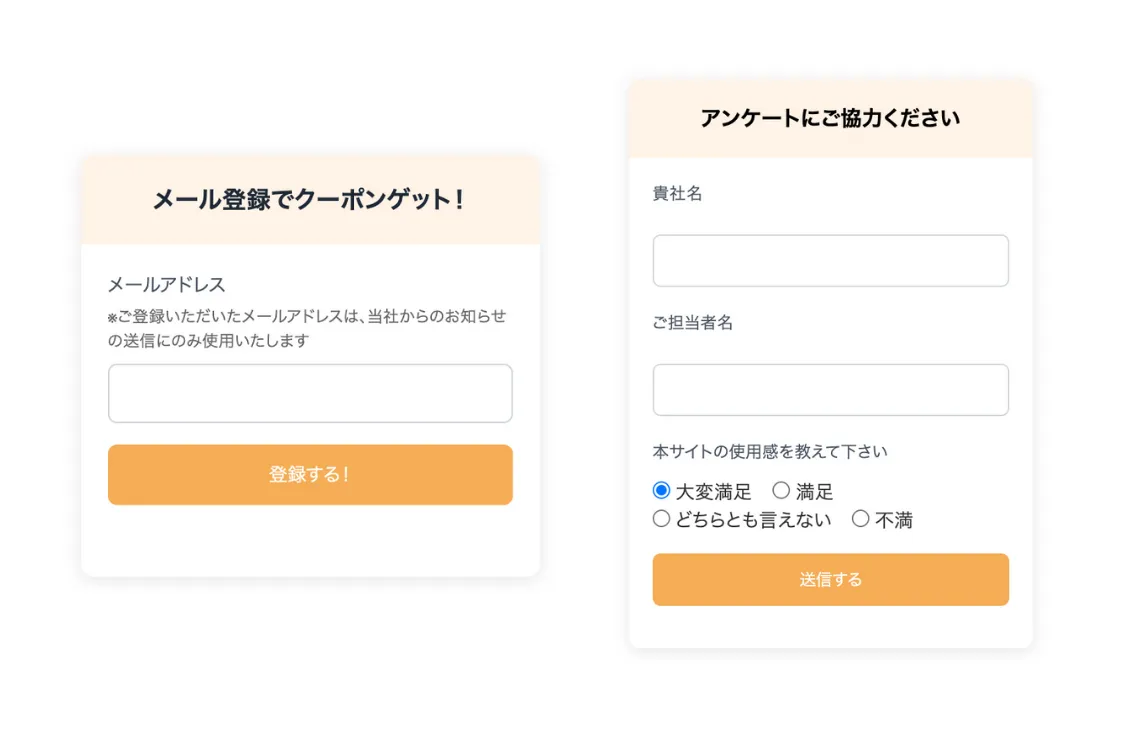 メール登録やアンケートなどの入力フォームを設置し、ユーザーのアクションを確実につなげます。